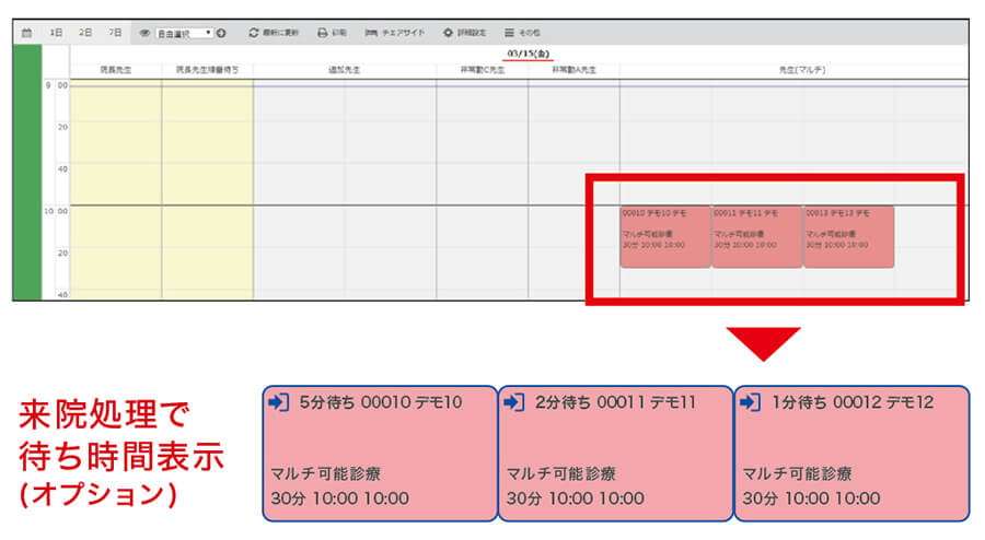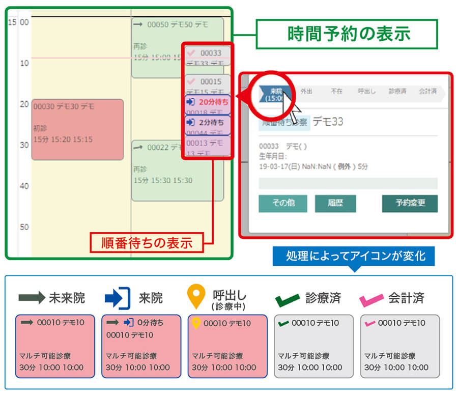 時間予約と順番待ち予約の併用に対応。時間予約と順番待ち予約状況と進行状況を一元管理可能です。