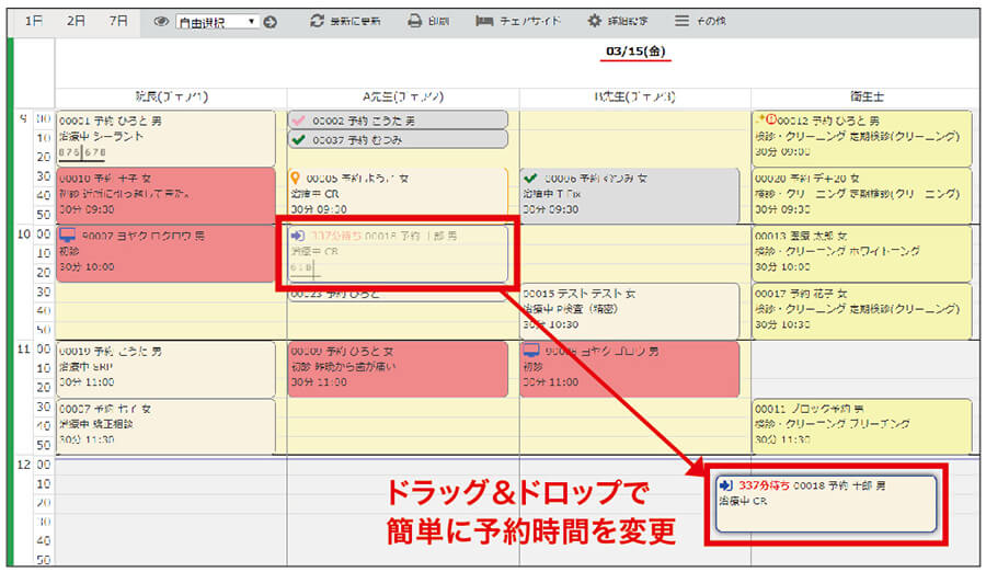 予約の変更にも面倒な入力とにかく不要。対象となる診察スケジュール項目を変更したい時間帯へドラッグ&ドロップするだけで簡単に予約時間の変更が可能です。