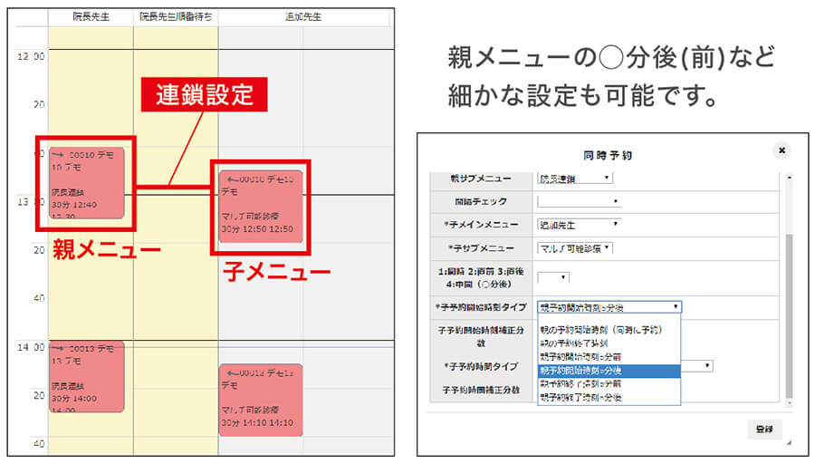 例えば胸部X線検査を指定した場合、合わせてレントゲン室の予約登録も行われるなど、関連する項目を紐付け、一度の操作で複数の登録を行えます。