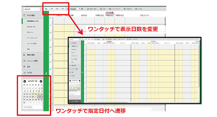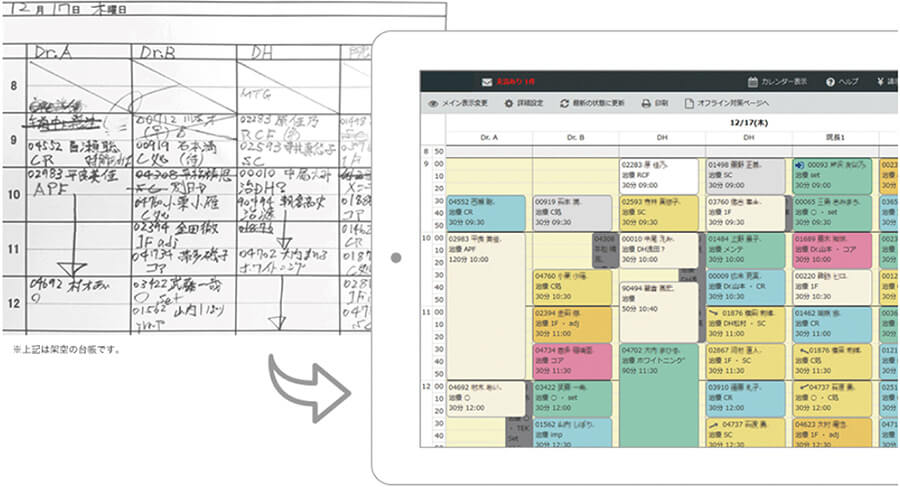 患者種別を色別管理することで、スケジュールをより直感的に管理・認識しやすく!高い視認性・操作性が、些細な勘違い等によるミスを抑制するともに、一つひとつの細かな業務にかかる時間を圧縮し、業務効率を大きく改善します。